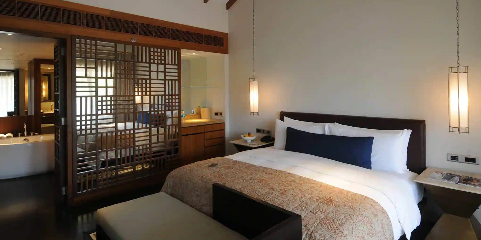 Each large suite features a separate living room, bedroom and a private balcony overlooking lush paddy fields or courtyard. Includes a walk-in wardrobe, stand-alone bathtub, mini-bar, 40” LCD TV, Wi-Fi, electronic safe. Can accommodate 2 adults + 2 children.