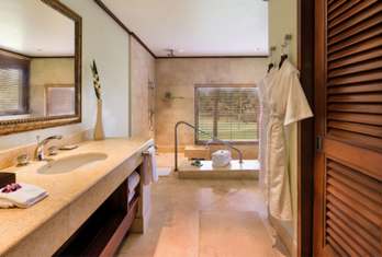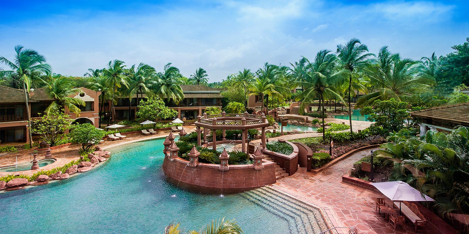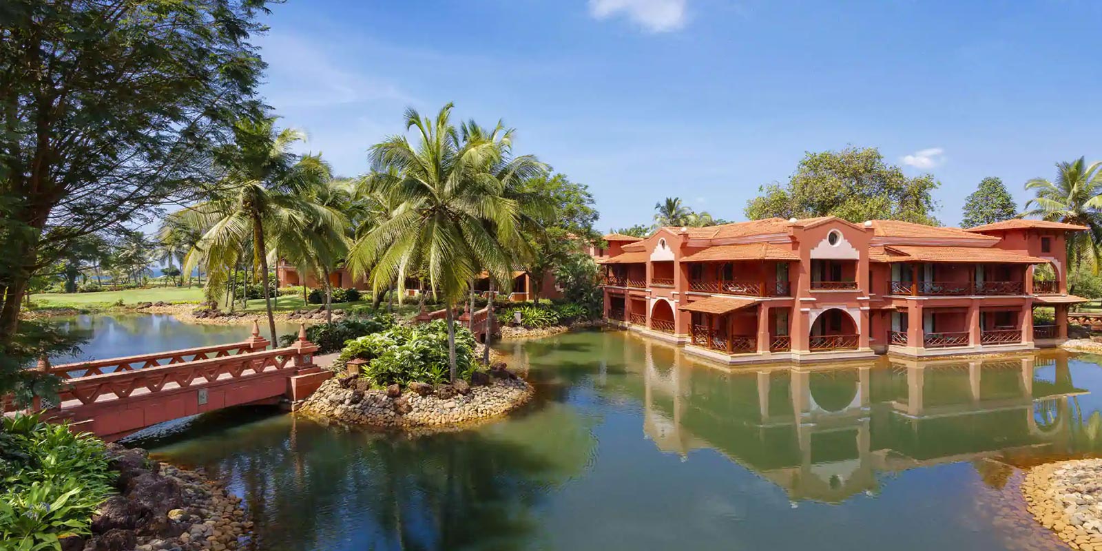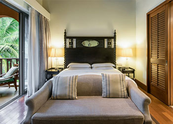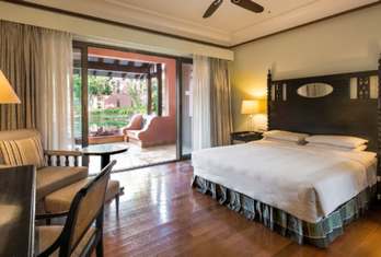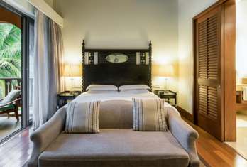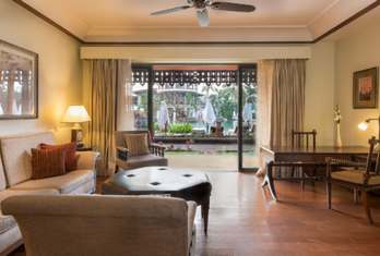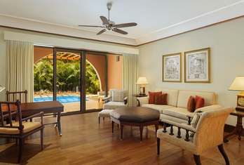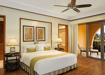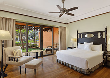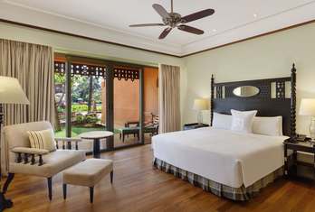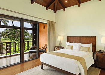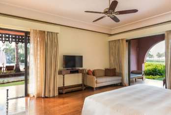 An aesthetically designed bedroom, with a separate living area and private balcony, with views of the shimmering lagoons. Rooms are with exotic Indo-Portuguese architecture and décor, spacious marble bath with a sunken tub, Coffee/Tea Maker, Electric kettle, Electronic safe, Satellite TV, Fruits Platter (on request), Iron/Ironing Board, Mini Bar, Pillow Menu, Mattress Customization (on request), Black out curtains, Sofa, Wardrobe, Turn Down Service (on request), Work Desk, Telephone, Wi-Fi, Multi Control Lighting Unit, Hair dryer, Shaving Mirror.
